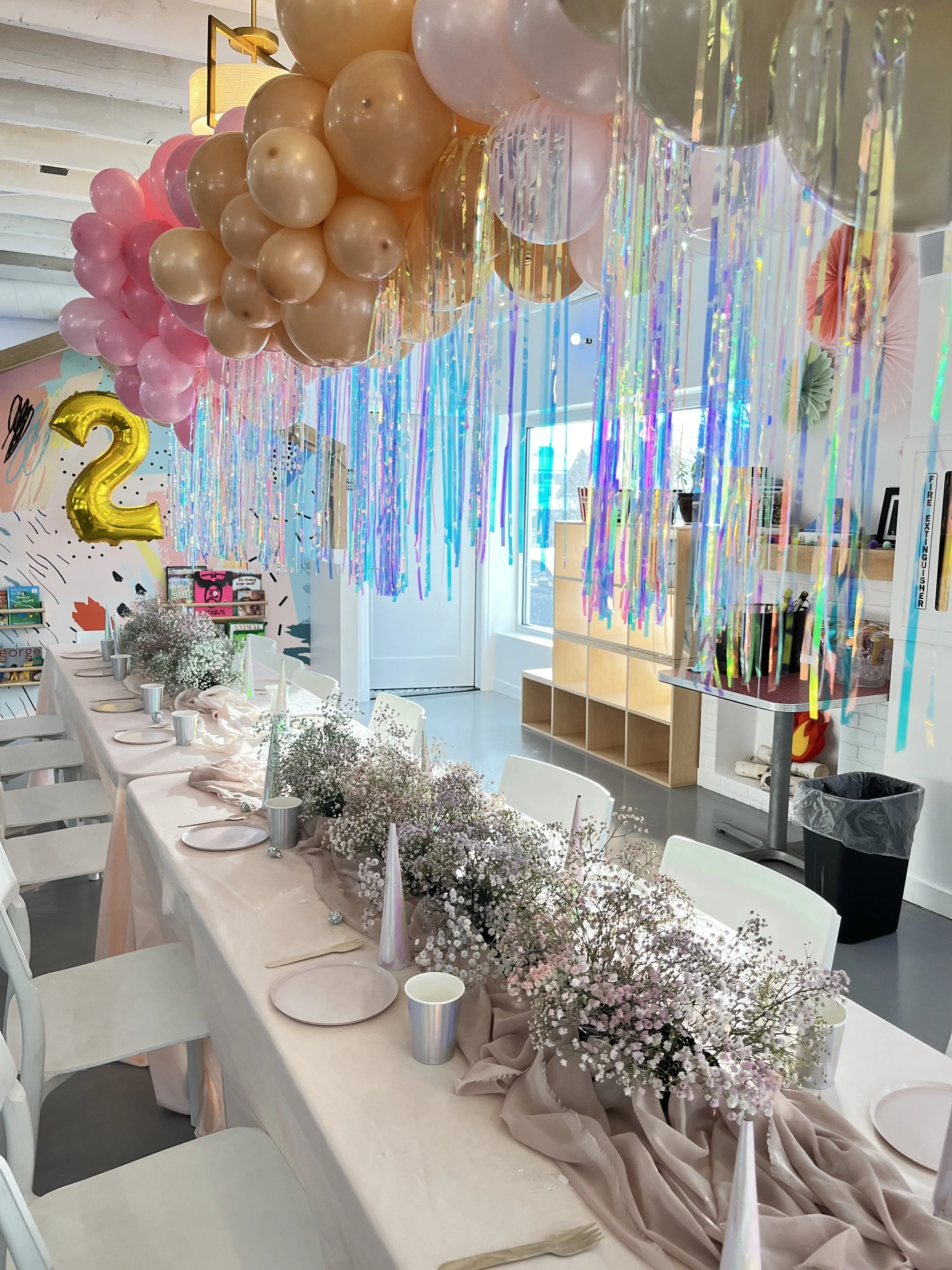 - Two large balloon garlands - over book nook and long table with tinsel. Number balloon, foil balloons and themed backdrop